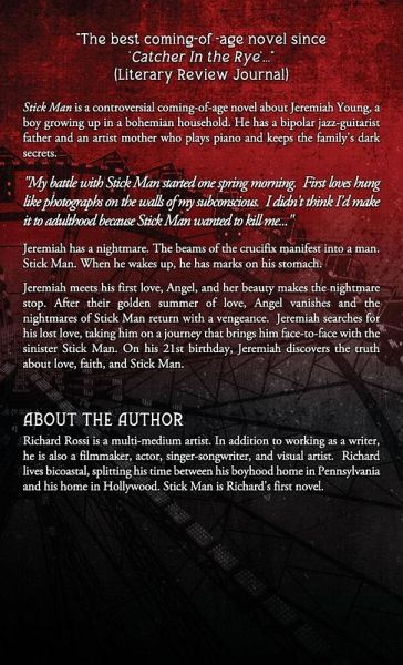 "The best coming-of age novel since 'Catcher In the Rye'..." (Literary Review Journal) Stick Man is a coming-of-age story about a boy named Jeremiah Young who grows up in a bohemian household: "My childhood in Pittsburgh was one of extremes. First loves hung like photographs on the walls of my subconscious. They lingered there in my memory to battle their antithesis - Stick Man. I didn't think I'd make it to adulthood alive because Stick Man wanted to kill me." Jeremiah Young is an imaginative prodigy. He paints and plays guitar. His father is a bi-polar jazz guitarist and his mother is a pianist who keeps the family secrets. She yells at Jeremiah and wants him to visit "God's house" with her. When Jeremiah visits Saint Joseph's Catholic Church for the first time, he has to leave early because he's frightened by the bloody man on the cross. He looks for God and finds the devil instead. This is the beginning of his idiosyncratic religious journey: "I gazed at the man on the sticks with nails stuck into his flesh. My eyes were riveted to the blood....When we exited the sanctuary, I looked up and saw the cross. The beams seemed to reach for me. For a moment, I was transfixed..." That night, Jeremiah has a nightmare of the beams of the crucifix manifesting into a man. Stick Man. When he wakes from the nightmare, he has marks on his stomach. Jeremiah believes true love is the force to vanquish evil. He meets his first love, a girl he calls "Angel." When he's with Angel, his nightmares stop. She inspires him to write songs and awakens something in him that he can't live without. He experiences good dreams for the first time: "Her lips were wet. I was dizzy. She cradled my face in her hands.Time slipped away..." They ride the rollercoaster at West View Park, the local amusement park. After the summer, Angel becomes cold towards him. The nightmares of Stick Man return to his dreams. Her departure remains clouded in mystery. A ghost visits him and tells him to find Angel again. He searches for her, believing she's the best antidote to Stick Man. His journey brings him face to face with Stick Man and his search for his lost Angel in an effort to come full circle with his past. Jeremiah has dynamic interplay with religion - and the gradual, ultimate reassessment of his beliefs. He experiences his strong ties to his dysfunctional family and his unbending drive to make art. As he reaches his twenty-first birthday, he discovers the startling truth about Angel, God, and Stick Man.