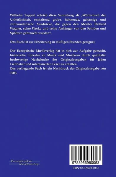 Wilhelm Tappert schrieb diese Sammlung als Wörterbuch der Unhöflichkeit, enthaltend grobe, höhnende, gehässige und verleumderische Ausdrücke, die gegen den Meister Richard Wagner, seine Werke und seine Anhänger von den Feinden und Spöttern gebraucht wurden .