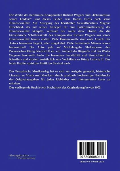 Die Werke des berühmten Komponisten Richard Wagner sind Bekenntnisse seines Leidens und dieses Leiden war Hanns Fuchs nach seine Homosexualität. Auf Anregung des berühmten Sexualforschers Magnus Hirschfeld, der mit seinen Kollegen für eine Entkriminalisierung der Homosexualität kämpfte, verfasste der Autor diese Studie, die die künstlerische Schaffenskraft des Komponisten Richard Wagner aus seiner Homosexualität heraus erklärt. Viele Homosexuelle sind nach Ansicht des Autors besonders begabt, oder umgekehrt: Viele bedeutende Männer waren homosexuell. Der Autor geht auf Michelangelo, Shakespeare, den Preussischen König Friedrich II etc. ein. Anhand der Biografie und des Werks Wagners beschreibt Fuchs die besondere Sensibilität und Sinnlichkeit des Künstlers und erörtert ausführlich sein Verhältnis zu König Ludwig II. Das letzte Kapitel spürt der Erotik im Parzival nach.
