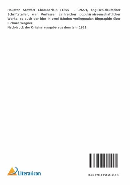 Houston Stewart Chamberlain (1855 - 1927), englisch-deutscher Schriftsteller, war Verfasser zahlreicher populärwissenschaftlicher Werke, so auch der hier in zwei Bänden vorliegenden Biographie über Richard Wagner. Nachdruck der Originalausgabe aus dem Jahr 1911.