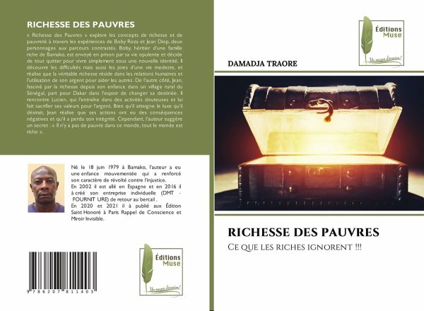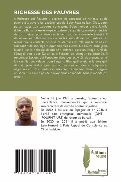 « Richesse des Pauvres » explore les concepts de richesse et de pauvreté à travers les expériences de Boby Roza et Jean Diop, deux personnages aux parcours contrastés. Boby, héritier d'une famille riche de Bamako, est envoyé en prison par sa vie opulente et décide de tout quitter pour vivre simplement sous une nouvelle identité. Il découvre les difficultés mais aussi les joies d'une vie modeste, et réalise que la véritable richesse réside dans les relations humaines et l'utilisation de son argent pour aider les autres. De l'autre côté, Jean, fasciné par la richesse depuis son enfance dans un village rural du Sénégal, part pour Dakar dans l'espoir de changer sa destinée. Il rencontre Lucien, qui l'entraîne dans des activités douteuses et lui fait sacrifier ses valeurs pour l'argent. Bien qu'il atteigne le luxe qu'il désirait, Jean réalise que ses actions ont eu des conséquences négatives et qu'il a perdu son intégrité. Cependant, l'auteur suggère un secret : « Il n'y a pas de pauvre dans ce monde, tout le monde est riche ».