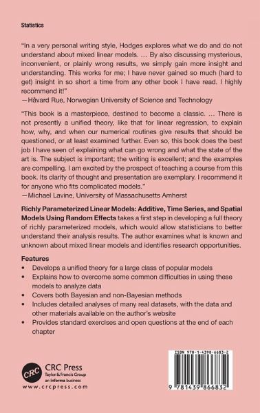 A First Step toward a Unified Theory of Richly Parameterized Linear Models Using mixed linear models to analyze data often leads to results that are mysterious, inconvenient, or wrong. Further compounding the problem, statisticians lack a cohesive resource to acquire a systematic, theory-based understanding of models with random effects. Richly Parameterized Linear Models: Additive, Time Series, and Spatial Models Using Random Effects takes a first step in developing a full theory of richly parameterized models, which would allow statisticians to better understand their analysis results. The author examines what is known and unknown about mixed linear models and identifies research opportunities. The first two parts of the book cover an existing syntax for unifying models with random effects. The text explains how richly parameterized models can be expressed as mixed linear models and analyzed using conventional and Bayesian methods. In the last two parts, the author discusses oddities that can arise when analyzing data using these models. He presents ways to detect problems and, when possible, shows how to mitigate or avoid them. The book adapts ideas from linear model theory and then goes beyond that theory by examining the information in the data about the mixed linear model's covariance matrices. Each chapter ends with two sets of exercises. Conventional problems encourage readers to practice with the algebraic methods and open questions motivate readers to research further. Supporting materials, including datasets for most of the examples analyzed, are available on the author's website.
