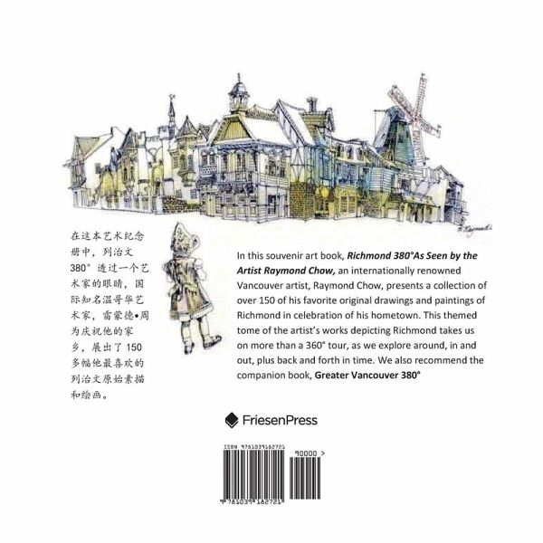 This souvenir art book, the first in a series, depicts past and present scenes from Richmond, British Columbia, featuring the original works of renowned Vancouver artist Raymond Chow. Laid out in a virtual tour format, Richmond 380° as Seen Through the Eyes of an Artist is an entertaining way to get to know more about the region and its history, as well as the artist himself. It is both a unique keepsake, showcasing 150-line drawings and acrylic paintings, and a travel guide, complete with a route map and at-times witty commentary, written by BC native Gary Towne, recommending many places to visit and enjoy. So, sit back and enjoy a full-circle panoramic journey through the charming and beautiful area of Richmond.