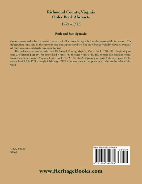 County court order books contain records of all matters brought before the court while in session. The information contained in these records may not appear elsewhere. The order books typically provide a synopsis of court cases in a relatively organized format. This volume contains records from Richmond County, Virginia, Order Book, 1718-1721, beginning on page 230 through page 234, for courts held 7 June 1721 through 7 June 1721. This volume also contains records from Richmond County, Virginia, Order Book No. 9, 1721-1732, beginning on page 1 through page 87, for courts held 5 July 1721 through 6 February 1722'23. An every-name and place index adds to the value of this work. (?), 2020, 8¿x11, paper, index, 128 pp.