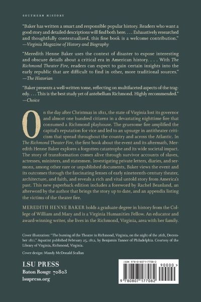 On the day after Christmas in 1811, the state of Virginia lost its governor and almost one hundred citizens in a devastating nighttime fire that consumed a Richmond playhouse. During the second act of a melodramatic tale of bandits, ghosts, and murder, a small fire kindled behind the backdrop. Within minutes, it raced to the ceiling timbers and enveloped the audience in flames. The tragic Richmond Theater fire would inspire a national commemoration and become its generation's defining disaster. A vibrant and bustling city, Richmond was synonymous with horse races, gambling, and frivolity. The gruesome fire amplified the capital's reputation for vice and led to an upsurge in antitheater criticism that spread throughout the country and across the Atlantic. Clerics in both America and abroad urged national repentance and denounced the stage, a sentiment that nearly destroyed theatrical entertainment in Richmond for decades. Local churches, by contrast, experienced a rise in attendance and became increasingly evangelical. In The Richmond Theater Fire, the first book about the event and its aftermath, Meredith Henne Baker explores a forgotten catastrophe and its wide societal impact. The story of transformation comes alive through survivor accounts of slaves, actresses, ministers, and statesmen. Investigating private letters, diaries, and sermons, among other rare or unpublished documents, Baker views the event and its outcomes through the fascinating lenses of early nineteenth-century theater, architecture, and faith, and reveals a rich and vital untold story from America's past.