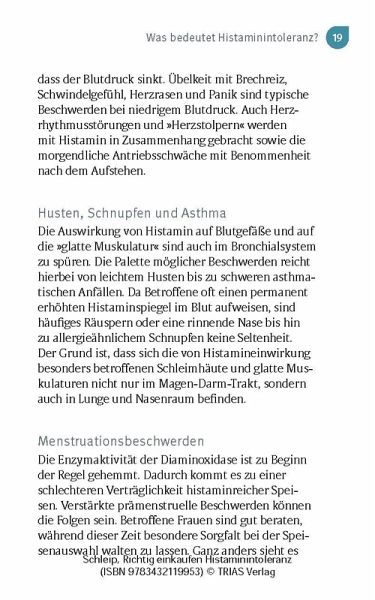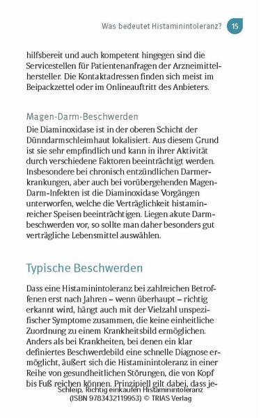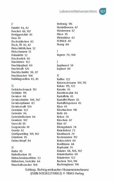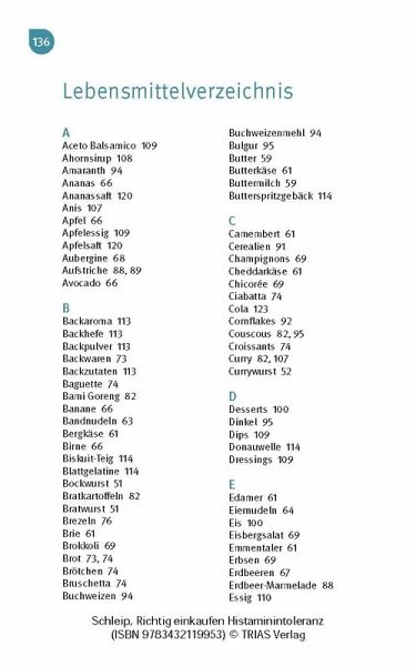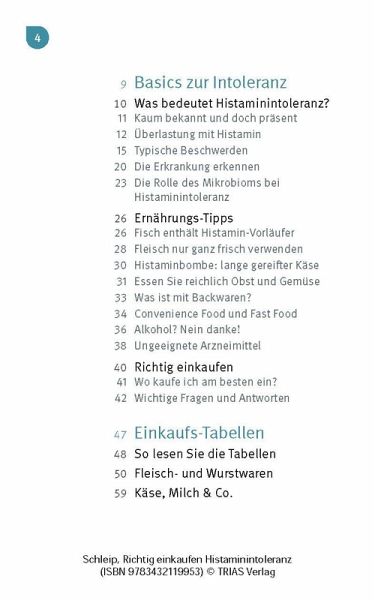 Die richtigen Lebensmittel auswählen ist bei einer Histaminunverträglichkeit manchmal nicht so einfach. Was kann ich bedenkenlos essen, was bereitet mir Beschwerden? Dieser handliche Einkaufsführer schafft Abhilfe: Praktische Einkaufs-Tabellen zeigen Ihnen, zu welchen Nahrungsmitteln Sie im Supermarkt, Bioladen und Reformhaus greifen können.