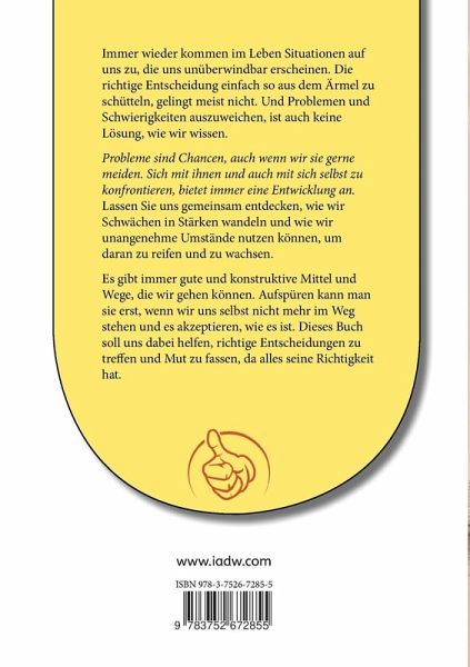 Immer wieder kommen im Leben Situationen auf uns zu, die uns unüberwindbar erscheinen. Die richtige Entscheidung einfach so aus dem Ärmel zu schütteln, gelingt meist nicht. Und Problemen und Schwierigkeiten auszuweichen, ist auch keine Lösung, wie wir wissen. Probleme sind Chancen, auch wenn wir sie gerne meiden. Sich mit ihnen und auch mit sich selbst zu konfrontieren, bietet immer eine Entwicklung an. Lassen Sie uns gemeinsam entdecken, wie wir Schwächen in Stärken wandeln und wie wir unangenehme Umstände nutzen können, um daran zu reifen und zu wachsen.Es gibt immer gute und konstruktive Mittel und Wege, die wir gehen können. Aufspüren kann man sie erst, wenn wir uns selbst nicht mehr im Weg stehen und es akzeptieren, wie es ist. Dieses Buch soll uns dabei helfen, richtige Entscheidungen zu treffen und Mut zu fassen, da alles seine Richtigkeit hat.