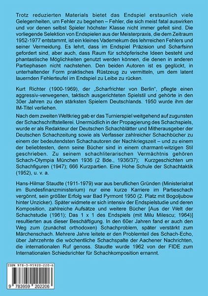 Trotz reduzierten Materials bietet das Endspiel erstaunlich viele Gelegenheiten, um Fehler zu begehen - Fehler, die sich meist fatal auswirken und vor denen selbst Spieler höchster Klasse nicht immer gefeit sind. Die vorliegende Selektion von Endspielen aus der Meisterpraxis, die dem Zeitraum 1952-1977 entstammt, ist ein kleines Vademekum des lehrreichen Fehlers und seiner Vermeidung. Es lehrt, dass im Endspiel Präzision und Scharfsinn gefordert sind, aber auch, dass Raum für schöpferische Ideen besteht und phantastische Möglichkeiten genutzt werden können, die denen in anderen Partiephasen nicht nachstehen. Den beiden Autoren ist es geglückt, in unterhaltender Form praktisches Rüstzeug zu vermitteln, um dem latent lauernden Fehlerteufel im Endspiel zu Leibe zu rücken. Kurt Richter (1900-1969), der "Scharfrichter von Berlin", pflegte einen aggressiv-verwegenen, taktisch ausgerichteten Spielstil und gehörte in den 30er Jahren zu den stärksten Spielern Deutschlands. 1950 wurde ihm der IM-Titel verliehen.Nach dem zweiten Weltkrieg gab er das Turnierspiel weitgehend auf zugunsten der Schachschriftstellerei. Unermüdlich in der Propagierung des Schachspiels, wurde er als Redakteur der Deutschen Schachblätter und Mitherausgeber der Deutschen Schachzeitung sowie als Verfasser zahlreicher Schachbücher zu einem der bedeutendsten Schachautoren der Nachkriegszeit - und zu einem der beliebtesten, denn seine Bücher sind in einem charmant-witzigen Stil geschrieben. Zu seinem schachliterarischen Vermächtnis gehören Schach-Olympia München 1936 (2 Bde., 1936/37); Kurzgeschichten um Schachfiguren (1947); 666 Kurzpartien. Eine Hohe Schule der Schachtaktik (1952), u. v. a. Hans-Hilmar Staudte (1911-1979) war aus beruflichen Gründen (Ministerialrat im Bundesfinanzministerium) nur eine kurze Karriere im Partieschach vergönnt, sein größter Erfolg war Bad Pyrmont 1950 (2. Platz mit Bogoljubow hinter Unzicker). Später widmete er sich intensiv der Endspielstudie und deren Komposition, zahlreiche Aufsätze und weitere Bücher [Aus der Welt der Schachstudie (1961); Das 1 x 1 des Endspiels (mit Milu Milescu; 1964)] resultierten aus dieser Beschäftigung. In den 60er Jahren fand er auch den Weg zum (zunächst orthodoxen) Schachproblem, später verstärkt zum Märchenschach. Mehrere Jahre leitete er den Problemteil des Schach-Echo, über Jahrzehnte die wöchentliche Schachspalte der Aachener Nachrichten, die internationalen Ruf genoss. Staudte wurde 1962 von der FIDE zum Internationalen Schiedsrichter für Schachkomposition ernannt.