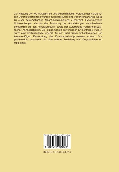 Die technologischen und wirtschaftlichen Vorziige des Schleifens im spit zenlosen Durchlaufverfahren konnen in der industriellen Fertigung oft mals nicht voll genutzt werden, wei! die Proze13technologie Eigenheiten be sitzt, die in ihrer Komplexitat empirisch nur schwer zu beherrschen sind. Daher wurde eine Analyse des Durchlaufschleifens vorgenommen, die aus gehend von den verfahrenstypischen Grundlagen Wege zu einer systemati schen Maschineneinstellung eroffnet. Es mu13ten zunachst die den Proze13 kennzeichnenden Gro13en definiert und strukturiert werden. Auf der Basis der System- und Stellgro13en konnte im weiteren eine Herleitung der pro ze13beschreibenden Kenngro13en durchgefiihrt werden. Technologische Gesetzma13igkeiten im Hinblick auf die Schleifspalteinstel lung wurden bei der Funktionsanalyse in folgenden Bereichen untersucht. - Ein Vergleich des Schneideneingriffs im Gleich- und Gegenlauf von Schleifscheibe und Werkstiick stellte Besonderheiten des spitzenlosen Schleifens heraus. - Unter dem Gesichtspunkt der Werkstiickfiihrung in radialer Richtung folg te der Bezug von Schleifscheiben- und Regelscheibentangentenwinkel als wichtige geometrische Gro13en auf die dreidimensionalen Verhaltnisse des Durchlaufschleifens. - Die Betrachtung der axialen Werkstiickfiihrung und der resultierenden Zylinderformabweichungen zeigte Funktionskriterien und Realisierungs moglichkeiten bei der Schleifspaltgestaltung auf.