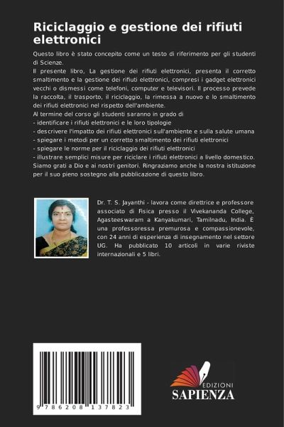 Questo libro è stato concepito come un testo di riferimento per gli studenti di Scienze.Il presente libro, La gestione dei rifiuti elettronici, presenta il corretto smaltimento e la gestione dei rifiuti elettronici, compresi i gadget elettronici vecchi o dismessi come telefoni, computer e televisori. Il processo prevede la raccolta, il trasporto, il riciclaggio, la rimessa a nuovo e lo smaltimento dei rifiuti elettronici nel rispetto dell'ambiente.Al termine del corso gli studenti saranno in grado di - identificare i rifiuti elettronici e le loro tipologie - descrivere l'impatto dei rifiuti elettronici sull'ambiente e sulla salute umana - spiegare i metodi per un corretto smaltimento dei rifiuti elettronici - spiegare le norme per il riciclaggio dei rifiuti elettronici - illustrare semplici misure per riciclare i rifiuti elettronici a livello domestico.Siamo grati a Dio e ai nostri genitori. Ringraziamo anche la nostra istituzione per il suo pieno sostegno alla pubblicazione di questo libro.