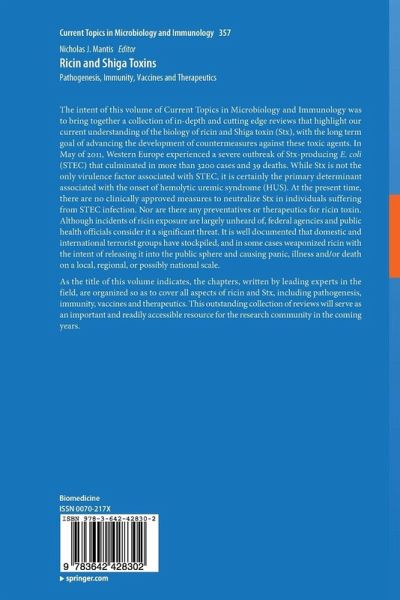 The chapters, written by leading experts in thefield, are organized so as to cover all aspects of ricin and Stx, including pathogenesis, immunity, vaccines and therapeutics. This outstanding collection of reviews will serve as an important and readily accessible resource for the research community in the coming years.