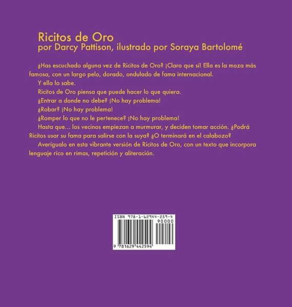 raducido por la homenajeada de Pura Belpré, Marianna Llanos ¿Has escuchado alguna vez de Ricitos de Oro? ¡Claro que sí! Ella es la moza más famosa, con un largo pelo, dorado, ondulado de fama internacional. Y ella lo sabe. Ricitos de Oro piensa que puede hacer lo que quiera. ¿Entrar a donde no debe? ¡No hay problema! ¿Robar? ¡No hay problema! ¿Romper lo que no le pertenece? ¡No hay problema! Hasta que... los vecinos empiezan a murmurar, y deciden tomar acción. ¿Podrá Ricitos usar su fama para salirse con la suya? ¿O terminará en el calabozo? Averígualo en esta vibrante versión de Ricitos de Oro, con un texto que incorpora lenguaje rico en rimas, repetición y aliteración. -- Have you heard of Goldilocks? Of course, you have! She's the name-fame-dame. That long-strong, bold-gold hair has earned her an international reputation. And she knows it. Goldilocks thinks she can do anything she wants. Breaking and entering? No problem. Theft? No problem. Damaging property? No problem. Until...the glitzy-see neighbors are tick-tock-talking. And they decide to take action. Will Goldilocks be able to use her fame-name to get out of trouble? Or will she wind up in folktale-jail? This fun spoof on Goldilocks is rollicking with word play: "Papa Troll clomped-stomped. 'Someone ate my meal for real. It's all woebegone-gone.'" This retelling of the folk/fairy tale creates a children's picture book that is sure to become a read-aloud classic.