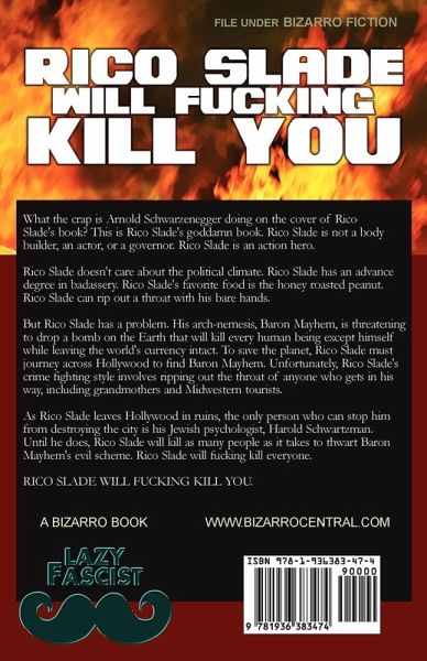 What the crap is Arnold Schwarzenegger doing on the cover of Rico Slade's book? This is Rico Slade's goddamn book. Rico Slade is not a body builder, an actor, or a governor. Rico Slade is an action hero. Rico Slade doesn't care about the political climate. Rico Slade has an advance degree in badassery. Rico Slade's favorite food is the honey-roasted peanut. Rico Slade can rip out a throat with his bare hands. But Rico Slade's arch nemesis, Baron Mayhem, is threatening to drop a bomb on the Earth that will kill every human being except himself while leaving the world's currency intact. To save the planet, Rico Slade must journey across Hollywood to find Baron Mayhem. Unfortunately, Rico Slade's crime fighting style involves ripping out the throat of anyone who gets in his way, including grandmothers and Midwestern tourists. As Rico Slade leaves Hollywood in ruins, the only person who can stop him from destroying the city is his Jewish psychologist, Harold Schwartzman. Until he does, Rico Slade will kill as many people as it takes to thwart Baron Mayhem's evil scheme. Rico Slade will fucking kill everyone. RICO SLADE WILL FUCKING KILL YOU.