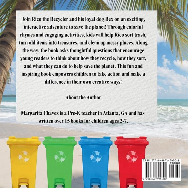 "Join Rico the Recycler and his loyal dog Rex on an exciting, interactive adventure to save the planet! Through colorful rhymes and engaging activities, kids will help Rico sort trash, turn old items into treasures, and clean up messy places. Along the way, the book asks thoughtful questions that encourage young readers to think about how they recycle, how they sort, and what they can do to help save the planet. This fun and inspiring book empowers children to act and make a difference in their creative ways!"