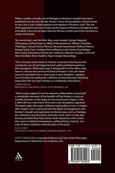 This multidisciplinary investigation facilitates a new conversation between Ricoeur scholars and those working in a variety of domains. While a number of books and anthologies on Ricoeur's thought have been published over the past decade, "Ricoeur Across the Disciplines" is unique in its multidisciplinary scope. The books currently on the market are typically one of either two kinds: either they provide a general overview of Ricoeur's thought or they focus on a narrow set of themes within a specific discipline (cf. list of competing titles). While other books may allude to the multidisciplinary potential for Ricoeur's thought, this book is the first to carry out a truly multidisciplinary investigation of Ricoeur's thought. The aim of this multidisciplinary investigation is not only to draw out the nuances of Ricoeur's thought but also to facilitate a new conversation between Ricoeur scholars and those working in a variety of domains.