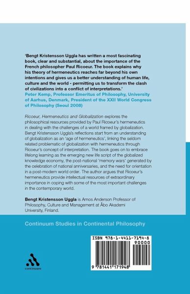 Ricoeur, Hermeneutics and Globalization explores the philosophical resources provided by Paul Ricoeur's hermeneutics in dealing with the challenges of a world framed by globalization. Bengt Kristensson Uggla's reflections start from an understanding of globalization as an 'age of hermeneutics', linking the seldom related problematic of globalization with hermeneutics through Ricoeur's concept of interpretation. The book proceeds to embrace lifelong learning as the emerging new life script of the globalized knowledge economy, the post-national 'memory wars' generated by the celebration of national anniversaries, and the need for orientation in a post-modern world order. The author argues that Ricoeur's hermeneutics provide intellectual resources of extraordinary importance in coping with some of the most important challenges in the contemporary world.