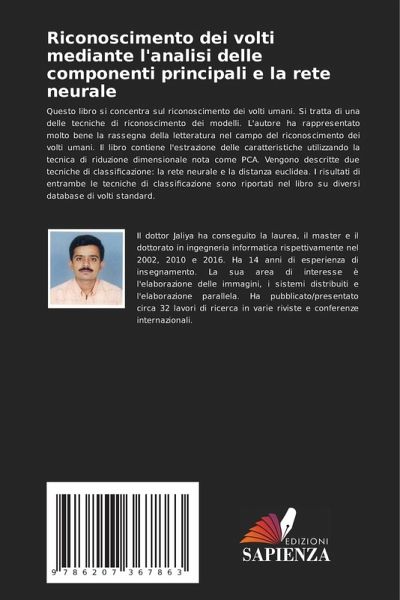 Questo libro si concentra sul riconoscimento dei volti umani. Si tratta di una delle tecniche di riconoscimento dei modelli. L'autore ha rappresentato molto bene la rassegna della letteratura nel campo del riconoscimento dei volti umani. Il libro contiene l'estrazione delle caratteristiche utilizzando la tecnica di riduzione dimensionale nota come PCA. Vengono descritte due tecniche di classificazione: la rete neurale e la distanza euclidea. I risultati di entrambe le tecniche di classificazione sono riportati nel libro su diversi database di volti standard.