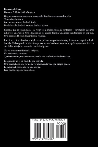 Ricos desde Cero Volumen 1: De la Calle al Imperio Hay personas que nacen con todo servido. Este libro no trata sobre ellas. Trata sobre los otros. Los que arrancaron desde el fondo. Desde la calle, desde el hambre, desde el olvido. Personas que no tenían nada -ni recursos, ni títulos, ni red de contactos- pero tenían algo más peligroso: una visión. Una idea que no los dejaba dormir. Una rabia transformada en impulso. Una necesidad brutal de cambiar su realidad. Este libro reúne historias verdaderas de quienes lo apostaron todo y levantaron imperios desde la nada. Cada capítulo revela cómo pensaron, qué decisiones tomaron, qué errores cometieron y qué hábitos forjaron su camino hacia la riqueza. No vas a encontrar fórmulas mágicas. Vas a encontrar caminos. Y, si estás atento, vas a reconocer señales que también están frente a vos. Porque esto no es un final. Es una entrada. Una puerta hacia otra forma de ver el dinero, la vida y tu propio poder. La próxima historia aún no está escrita. Pero podría empezar justo ahora.