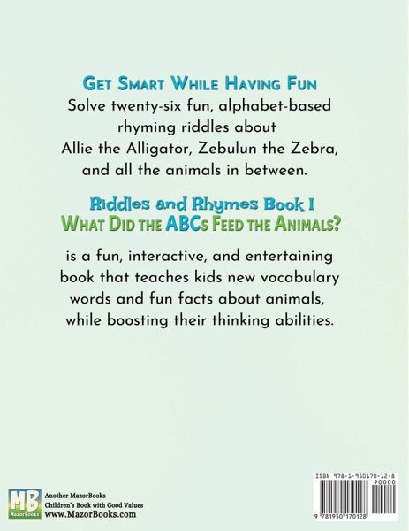 The Value of Riddles and Rhymes Get Smart While Having Fun Twenty six clever Riddle Rhymes that entertain and engage children: Allie the Alligator Wanted to eat She asked the letter A For her favorite treat What did the letter A give Allie? In addition to the riddle's answer (a food that begins with the letter A), kids will also gain knowledge about each of the 26 animals' feeding habits: For example: Alligators sometimes snack on fruit, but they usually eat fish, turtles, mammals, and reptiles. Young alligators also eat worms, snails, and insects. Plus Fun Fact: Alligators continue to grow throughout their lifetime. - And your kids will get smarter while having fun because simple rhymes are fun and easy for children to learn. - Rhymes build children’s awareness of sounds and tunes and often expose them to patterns that they may not hear in their interaction with parents, siblings, or friends. - Further yet, repeating rhymes helps children focus and concentrate and improve their memory. Riddles are also extremely beneficial for children’s cognitive development. - Solving riddles enhances children’s thinking ability, develops their imagination, and promotes their creativity. Riddles and Rhymes Book I combines easy-to-repeat rhymes and fun riddles that will keep children entertained as they expand their vocabulary, learn new sounds and patterns, and advance their thinking ability. See the full library of Children's Books With Good Values on www.MazorBooks.com