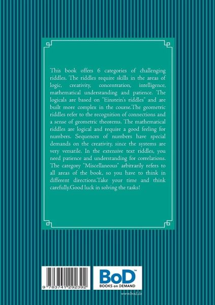 After a great success on the German market, this first part of the riddle series is also available in English. The demands on the reader´s creativity and concentration are sometimes very high.Riddle lovers and friends of mental exercise will have great pleasure in solving these tasks. The 6 different categories of riddles require mental flexibility, creative thinking and a high degree of concentration of the reader. Especially, the riddles of logic, the textriddles and geometric riddles are all done individually and repeatedly require special approaches. This requires patience, intelligence, concentration and of course ambition. The mathematical part allows a first familiarization with easy tasks which continuously get much more sophisticated. Have brains, show patience and sophistication. For some riddles, some hints are given (besides the actual solution) in the solution part. That way, you can be guided in the right direction without immediately get to know the solution. Face up to these specific tasks.
