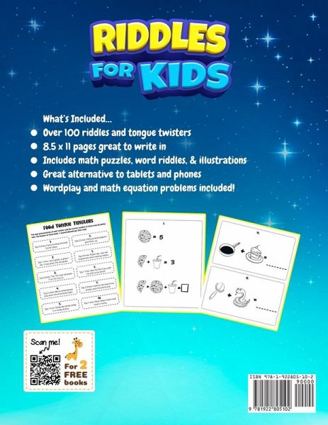 Features Include:Over 100 riddles and tongue twisters 8.5 x 11 pages great to write in Includes math puzzles, word riddles, & illustrations A great alternative to tablets and phones Wordplay and math equation Problems included!
