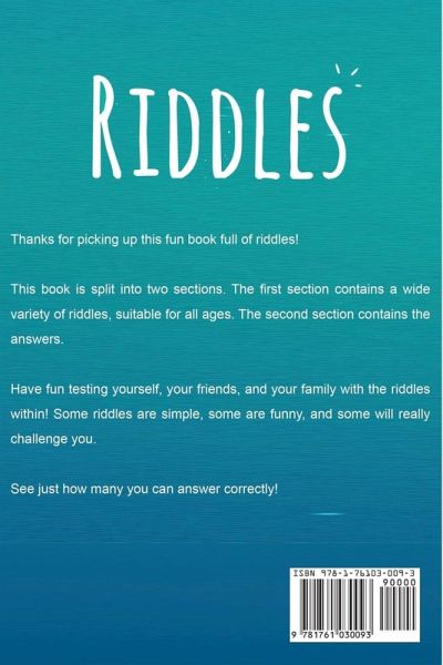 RIDDLES This fun book of riddles is split into two sections. The first section contains a wide variety of riddles, suitable for all ages. The second section contains the answers! Have fun testing yourself, your friends, and your family with the riddles within! Some riddles are simple, some are funny, and some will really challenge you. See just how many you can answer correctly!