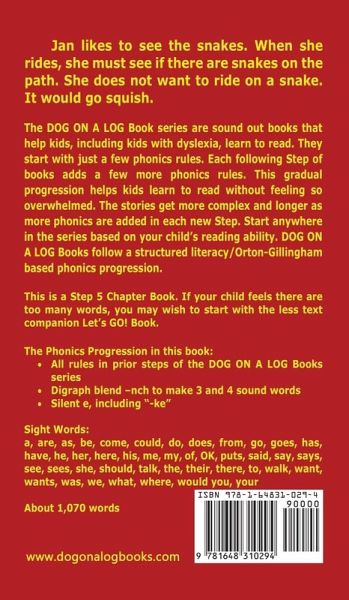 This book has about 1,070 words. The DOG ON A LOG Book series helps kids, including kids with dyslexia, learn to read. They are sound out books that start with just a few phonics rules. Each following Step of books adds a few more phonics rules and sight words. This gradual progression helps kids learn to read without feeling so overwhelmed. Start anywhere in the series based on your child's reading skills. The word list below will help you decide where in the series your child should start. Printable game boards, flashcards, handwriting sheets, and more are available to for additional practice. Information on the printables is provided in each book. The (purple) Let's GO! books have fewer words for new or less confident readers. The (red) chapter books are longer for more reading practice. Kids enjoy these stories that get more complex and longer as more phonics are added throughout the series. Books can be purchased individually or as collection volumes. This is an individual Step 5 Chapter Book. Additional information on using this series is available in the digital book HOW TO USE DECODABLE BOOKS TO TEACH READING. DOG ON A LOG Books follow an Orton Gillingham/systematic-phonics progression. DOG ON A LOG "What Step Should We Start With?" Word List Have your child read the following words. If they can't read every word in a Step, that is probably the step they should start with. For some kids, you may want to start at an earlier Step so they can build confidence in their reading ability. Step 1 fin, mash, sock, sub, cat, that, Dan's Step 2 less, bats, tell, mall, chips, whiff, falls Step 3 bangs, dank, honk, pings, chunk, sink, gong, rungs Step 4 silk, fluff, smash, krill, drop, slim, whisk Step 5 hunch, crate, rake, tote, inch, mote, lime Step 6 child, molts, fold, hind, jolt, post, colds Step 7 strive, scrape, splint, twists, crunch, prints, blend Step 8 finish, denim, within, bathtub, sunset, medic, habit Step 9 hundred, goldfinch, tree, wheat, inhale, play, Joe Step 10 be, remake, spry, repeat, silo, sometime, pinwheel Step 11 far, north, spire, turn, inhabit, calculate, Wyoming Many early reader books or leveled books are written so they cannot be sounded out. Kids often struggle and grow frustrated when they can't sound out the words. However, kids who have been taught the phonics and sight words in DOG ON A LOG Books can be proud when they are able to sound out and read almost every word. Paper books are optimized for learners with dyslexia. They have cream colored paper, black and white images, and large Verdana font. Research has shown Verdana is one of the most dyslexia-friendly fonts. More DOG ON A LOG Books: DOG ON A LOG Pup Books ---Before the Squiggle Code (Pre-Reading Skills) ---The Squiggle Code (Learning Letters and Words) ---Kids' Squiggles (First Stories) DOG ON A LOG Parent and Teacher Guides ---Teaching a Struggling Reader: One Mom's Experience with Dyslexia ---How to Use Decodable Books to Teach Reading Relevant portions of the DOG ON A LOG Phonics Progression (Scope and Sequence) and the Quick Assessment Tool ("What Step Should We Start With?" Word List) are inside each book. WATCH FOR MORE STEPS AND BOOKS COMING SOON