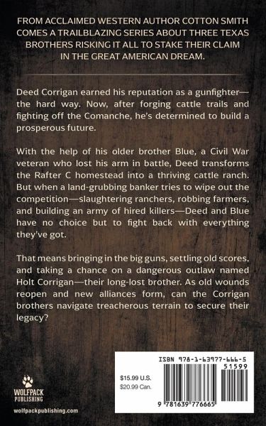 From acclaimed Western author Cotton Smith comes a trailblazing series about three Texas brothers risking it all to stake their claim in the great American dream. Deed Corrigan earned his reputation as a gunfighter-the hard way. Now, after forging cattle trails and fighting off the Comanche, he's determined to build a prosperous future. With the help of his older brother Blue, a Civil War veteran who lost his arm in battle, Deed transforms the Rafter C homestead into a thriving cattle ranch. But when a land-grubbing banker tries to wipe out the competition-slaughtering ranchers, robbing farmers, and building an army of hired killers-Deed and Blue have no choice but to fight back with everything they've got. That means bringing in the big guns, settling old scores, and taking a chance on a dangerous outlaw named Holt Corrigan-their long-lost brother. As old wounds reopen and new alliances form, can the Corrigan brothers navigate treacherous terrain to secure their legacy?