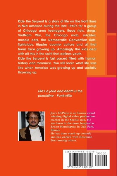 Ride the Serpent is a story of life on the front lines in Mid America during the late 1960's for a group of Chicago area teenagers. Race riots, drugs, Vietnam War, the Chicago mob, suicides, muscle cars, sexual passion, the Democratic Convention riots, fight clubs, Hippies counter culture and all that teens face growing up. Amazingly the kids deal with all this in the spirit that defines youth. Ride the Serpent is fast paced filled with humor, history and romance. You will learn what life was like when America was growing up and socially throwing up.
