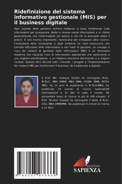 Ogni aspetto della gestione nell'era moderna si basa fortemente sulle informazioni per prosperare. Nulla si muove senza informazioni e si ritiene generalmente che l'informazione sia potere e che chi la possiede abbia il potere. È una risorsa importante, necessaria per sviluppare altre risorse. L'evoluzione delle circostanze e degli ambienti ha reso necessaria una corretta diffusione delle informazioni a vari livelli di gestione. Lo sviluppo e l'uso dei sistemi di gestione delle informazioni (MIS) è un fenomeno moderno che riguarda l'uso di informazioni appropriate che porteranno a una migliore pianificazione, a un migliore processo decisionale e a migliori risultati. Questo libro discute tutti i concetti, i progetti e l'implementazione dei moderni MIS per trasformare il business da tradizionale a digitale.