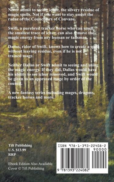 Never admit to seeing ichur, the silvery residue of magic spells. Not if you want to stay under the radar of the Councillors of Convane. Swift, a pure bred tracker horse who can smell the smallest trace of ichur, can also remove the magic energy from any human or talisman. Dallas, rider of Swift, knows how to create a spell without leaving residue, even if he is not a trained mage. Neither Dallas or Swift admit to seeing and using the magic energy. If they did, Dallas would have his ability to see ichur removed, and Swift would be given to an approved mage by order of the council. A new fantasy series including mages, dragons, tracker horses and more.