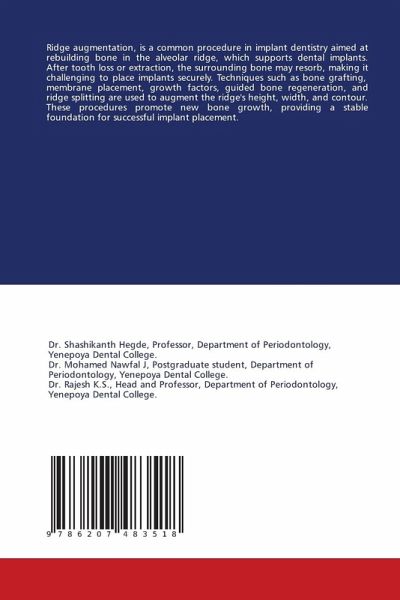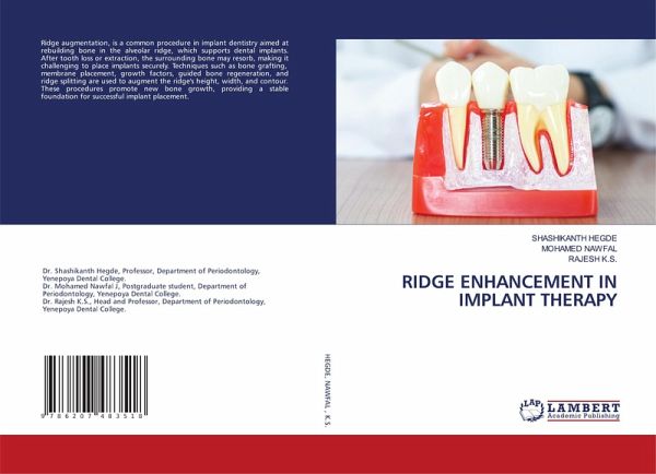 Ridge augmentation, is a common procedure in implant dentistry aimed at rebuilding bone in the alveolar ridge, which supports dental implants. After tooth loss or extraction, the surrounding bone may resorb, making it challenging to place implants securely. Techniques such as bone grafting, membrane placement, growth factors, guided bone regeneration, and ridge splitting are used to augment the ridge's height, width, and contour. These procedures promote new bone growth, providing a stable foundation for successful implant placement.