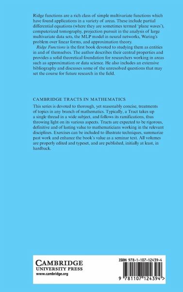 Ridge functions are a rich class of simple multivariate functions which have found applications in a variety of areas. These include partial differential equations (where they are sometimes termed 'plane waves'), computerised tomography, projection pursuit in the analysis of large multivariate data sets, the MLP model in neural networks, Waring's problem over linear forms, and approximation theory. Ridge Functions is the first book devoted to studying them as entities in and of themselves. The author describes their central properties and provides a solid theoretical foundation for researchers working in areas such as approximation or data science. He also includes an extensive bibliography and discusses some of the unresolved questions that may set the course for future research in the field.