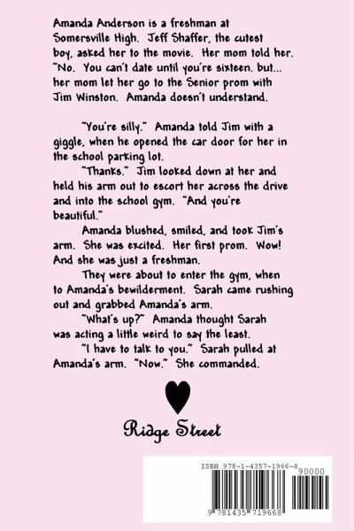 Amanda Anderson is a freshman at Somersville High. Jeff Shaffer, the cutest boy, asked her to the movie. Her mom told her, ""No."" You can't date until you're sixteen. but... her mom let her go to the Senior prom with Jim Winston. Amanda doesn't understand. ""You're silly."" Amanda told Jim with a giggle, when he opened the car door for her in the school parking lot. ""Thanks."" Jim looked down at her and held his arm out to escort her across the drive and into the gym. ""And you're beautiful."" Amanda blushed, smiled, and took Jim's arm. She was excited. Her first prom. Wow! And she was just a freshman. They were about to enter the gym, when to Amanda's bewilderment. Sarah came rushing out and grabbed Amanda's arm. ""What's up?"" Amanda thought Sarah was acting a little weird to say the least. ""I have to talk to you."" Sarah pulled at Amanda's arm. ""Now!"" She commanded.