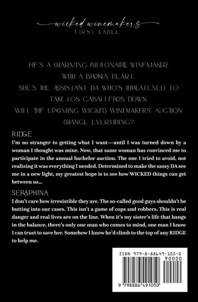 He's a charming billionaire winemaker with a broken heart. She's the assistant DA who's threatened to take Los Caballeros down. Will the upcoming WICKED WINEMAKERS' auction change everything? RIDGE I'm no stranger to getting what I want-until I was turned down by a woman I thought was mine. Now, that same woman has convinced me to participate in the annual bachelor auction. The one I tried to avoid, not realizing it was everything I needed. Determined to make the sassy DA see me in a new light, my greatest hope is to see how WICKED things can get between us... SERAPHINA I don't care how irresistible they are. The so-called good guys shouldn't be butting into our cases. This isn't a game of cops and robbers. This is real danger and real lives are on the line. When it's my sister's life that hangs in the balance, there's only one man who comes to mind, one man I know I can trust to save her. Somehow I know he'd climb to the top of any RIDGE to help me.