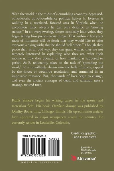 Depressed, out-of-work, out-of-confidence political lawyer E. Everton is walking in a restricted, forested area in Virginia when he encounters three objects he can only describe as "moving statues." In an overpowering, almost comically loud voice, they begin telling him preposterous things: That within a few years most of humanity will be dead; that they would like to offer everyone a dying wish; that he should "tell others". Though they prove that, in an odd way, they can grant wishes, they are not remotely interested in explaining who they are, what their motive is, how they operate, or how mankind is supposed to perish. As E. reluctantly takes on the task of "spreading the word", he is unwillingly drawn into the halls of power, tapped by the forces of would-be revolution, and enmeshed in an impossible romance. As E.'s journey progresses, thousands of lives begin to change, and even the ancient concepts of death and salvation take a strange, twisted turn.