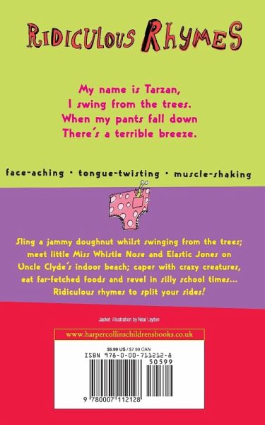 RIDICULOUS RHYMES is the second of 4 sparkling new collections of nonsense poems which mark the return of Collins Children’s Books to poetry publishing. John Foster is a well-known poet, teacher, and his book, WHAM BANG ORANGUTAN is hugely popular (OUP). He is highly-regarded both in the trade and in schools. The books use both new and existing material with humorous line illustrations thorughout. Well-known poets are included such as Spike Milligan, Michael Rosen, Pam Ayers, Jez Alborough and John Foster himself. Where do dinner ladies eat while you enjoy their cooking? They pop out to the burger bar when non one else is looking. Jez Alborough