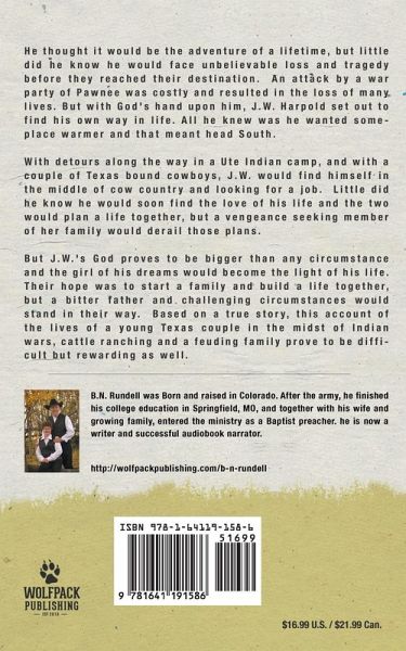 He thought it would be the adventure of a lifetime, but little did he know he would face unbelievable loss and tragedy before they reached their destination. An attack by a war party of Pawnee was costly and resulted in the loss of many lives. But with God's hand upon him, J.W. Harpold set out to find his own way in life. All he knew was he wanted someplace warmer and that meant head South. With detours along the way in a Ute Indian camp, and with a couple of Texas bound cowboys, J.W. would find himself in the middle of cow country and looking for a job. Little did he know he would soon find the love of his life and the two would plan a life together, but a vengeance seeking member of her family would derail those plans. But J.W.'s God proves to be bigger than any circumstance and the girl of his dreams would become the light of his life. Their hope was to start a family and build a life together, but a bitter father and challenging circumstances would stand in their way. Based on a true story, this account of the lives of a young Texas couple in the midst of Indian wars, cattle ranching and a feuding family prove to be difficult but rewarding as well.