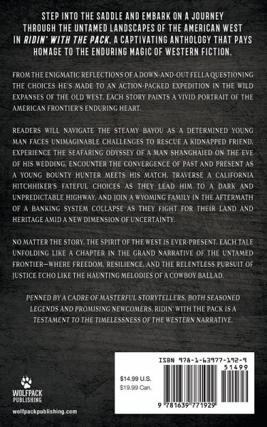 Step into the saddle and embark on a journey through the untamed landscapes of the American West in Ridin' with the Pack, a captivating anthology that pays homage to the enduring magic of Western fiction. From the enigmatic reflections of a down-and-out fella questioning the choices he's made to an action-packed expedition in the wild expanses of the Old West, each story paints a vivid portrait of the American frontier's enduring heart. Readers will navigate the steamy bayou as a determined young man faces unimaginable challenges to rescue a kidnapped friend, experience the seafaring odyssey of a man shanghaied on the eve of his wedding, encounter the convergence of past and present as a young bounty hunter meets his match, traverse a California hitchhiker's fateful choices as they lead him to a dark and unpredictable highway, and join a Wyoming family in the aftermath of a banking system collapse as they fight for their land and heritage amid a new dimension of uncertainty. No matter the story, the spirit of the West is ever-present, each tale unfolding like a chapter in the grand narrative of the untamed frontier-where freedom, resilience, and the relentless pursuit of justice echo like the haunting melodies of a cowboy ballad. Penned by a cadre of masterful storytellers, both seasoned legends and promising newcomers, Ridin' with the Pack is a testament to the timelessness of the Western narrative. Ridin' with the Pack: A Western Short Story Collection features Western short stories by: New York Times Best-Selling Author W. Michael Gear Best-Selling Author Peter Brandvold Best-Selling Author B.N. Rundell Best-Selling Author L.J. Martin Best-Selling Author Ken Pratt Award-Winning Author John D. Nesbitt Award-Winning Author Chris Mullen