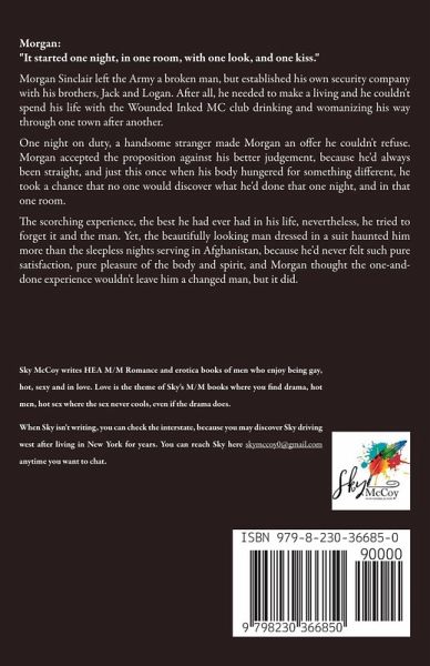 Morgan: "It started one night, in one room, with one look, and one kiss." Morgan Sinclair left the Army a broken man, but established his own security company with his brothers, Jack and Logan. After all, he needed to make a living and he couldn't spend his life with the Wounded Inked MC club drinking and womanizing his way through one town after another. One night on duty, a handsome stranger made Morgan an offer he couldn't refuse. Morgan accepted the proposition against his better judgement, because he'd always been straight, and just this once when his body hungered for something different, he took a chance that no one would discover what he'd done that one night, and in that one room. The scorching experience, the best he had ever had in his life, nevertheless, he tried to forget it and the man. Yet, the beautifully looking man dressed in a suit haunted him more than the sleepless nights serving in Afghanistan, because he'd never felt such pure satisfaction, pure pleasure of the body and spirit, and Morgan thought the one-and-done experience wouldn't leave him a changed man, but it did.