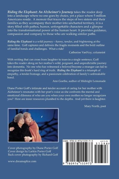 Now in its SECOND EDITION, Riding the Elephant: An Alzheimer's Journey takes the reader deep into a landscape where no one goes by choice, yet a place where 5 million Americans reside. A memoir that traces the steps of two sisters and their families as they accompany their mother into uncharted territory, it is a story filled with pathos, humor, unforgettable characters and a glimpse into the transformational power of the human heart. It provides guidance, compassion and company to those who are walking similar paths.