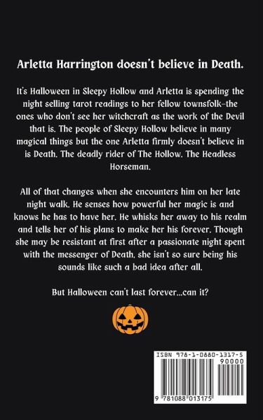 Arletta Harrington doesn't believe in Death. It's Halloween in Sleepy Hollow and Arletta is spending the night selling tarot readings to her fellow townsfolk-the ones who don't see her witchcraft as the work of the Devil that is. The people of Sleepy Hollow believe in many magical things but the one Arletta firmly doesn't believe in is Death. The deadly rider of The Hollow. The Headless Horseman. All of that changes when she encounters him on her late night walk. He senses how powerful her magic is and knows he has to have her. He whisks her away to his realm and tells her of his plans to make her his forever. Though she may be resistant at first after a passionate night spent with the messenger of Death, she isn't so sure being his sounds like such a bad idea after all. But Halloween can't last forever...can it?