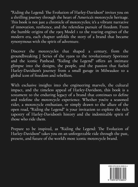 "Riding the Legend: The Evolution of Harley-Davidson" invites you on a thrilling journey through the heart of America's motorcycle heritage. This book is not just a chronicle of motorcycles; it's a vibrant narrative of innovation, resilience, and the relentless pursuit of freedom. From the humble origins of the 1903 Model 1 to the roaring engines of the modern era, each chapter unfolds the story of a brand that became synonymous with the spirit of adventure. Discover the motorcycles that shaped a century, from the groundbreaking J Series of the 1920s to the revolutionary Sportster and the iconic Panhead. "Riding the Legend" offers an intimate glimpse into the designs, the people, and the passion that fueled Harley-Davidson's journey from a small garage in Milwaukee to a global icon of freedom and rebellion. With exclusive insights into the engineering marvels, the cultural impact, and the timeless appeal of Harley-Davidson, this book is a testament to the enduring legacy of a brand that continues to define and redefine the motorcycle experience. Whether you're a seasoned rider, a motorcycle enthusiast, or simply drawn to the allure of the open road, "Riding the Legend" is your invitation to explore the rich tapestry of Harley-Davidson's history and the indomitable spirit of those who ride them. Prepare to be inspired, as "Riding the Legend: The Evolution of Harley-Davidson" takes you on an unforgettable ride through the past, present, and future of the world's most iconic motorcycle brand.