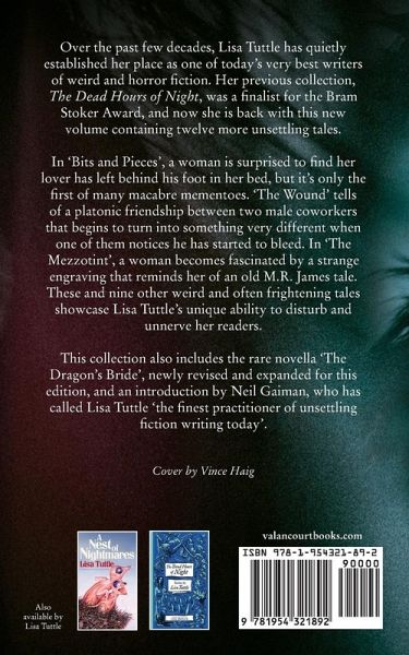 Over the past few decades, Lisa Tuttle has quietly established her place as one of today's very best writers of weird and horror fiction. Her previous collection, The Dead Hours of Night, was a finalist for the Bram Stoker Award, and now she is back with this new volume containing twelve more unsettling tales. In 'Bits and Pieces', a woman is surprised to find her lover has left behind his foot in her bed, but it's only the first of many macabre mementoes. 'The Wound' tells of a platonic friendship between two male coworkers that begins to turn into something very different when one of them notices he has started to bleed. The protagonist of 'The Hungry Hotel' is contacted years later by an old one-night stand and goes to meet him at a strange hotel, with unforeseen consequences. These and nine other weird and often frightening tales showcase Lisa Tuttle's unique ability to disturb and unnerve her readers. This collection also includes the rare novella 'The Dragon's Bride', newly revised and expanded for this edition, and an introduction by Neil Gaiman, who has called Lisa Tuttle 'the finest practitioner of unsettling fiction writing today'.