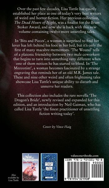 Over the past few decades, Lisa Tuttle has quietly established her place as one of today's very best writers of weird and horror fiction. Her previous collection, The Dead Hours of Night, was a finalist for the Bram Stoker Award, and now she is back with this new volume containing twelve more unsettling tales. In 'Bits and Pieces', a woman is surprised to find her lover has left behind his foot in her bed, but it's only the first of many macabre mementoes. 'The Wound' tells of a platonic friendship between two male coworkers that begins to turn into something very different when one of them notices he has started to bleed. The protagonist of 'The Hungry Hotel' is contacted years later by an old one-night stand and goes to meet him at a strange hotel, with unforeseen consequences. These and nine other weird and often frightening tales showcase Lisa Tuttle's unique ability to disturb and unnerve her readers. This collection also includes the rare novella 'The Dragon's Bride', newly revised and expanded for this edition, and an introduction by Neil Gaiman, who has called Lisa Tuttle 'the finest practitioner of unsettling fiction writing today'.
