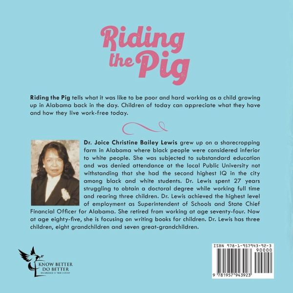 Riding the Pig tells what it was like to be poor and hard working as a child growing up in Alabama back in the day. Children of today can appreciate what they have and how they live work-free today.