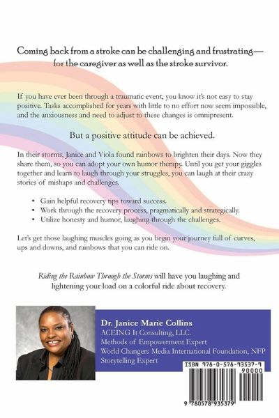 Coming back from a stroke can be challenging and frustrating- for the caregiver as well as the stroke survivor. Dr. Janice Marie Collins ACEING It Consulting, LLC. Methods of Empowerment Expert World Changers Media International Foundation, NFP Storytelling Expert If you have ever been through a traumatic event, you know it's not easy to stay positive. Tasks accomplished for years with little to no effort now seem impossible, and the anxiousness and need to adjust to these changes is omnipresent. But a positive attitude can be achieved. In their storms, Janice and Viola found rainbows to brighten their days. Now they share them, so you can adopt your own humor therapy. Until you get your giggles together and learn to laugh through your struggles, you can laugh at their crazy stories of mishaps and challenges. ¿ Gain helpful recovery tips toward success. ¿ Work through the recovery process, pragmatically and strategically. ¿ Utilize honesty and humor, laughing through the challenges. Let's get those laughing muscles going as you begin your journey full of curves, ups and downs, and rainbows that you can ride on. Riding the Rainbow Through the Storms will have you laughing and lightening your load on a colorful ride about recovery.