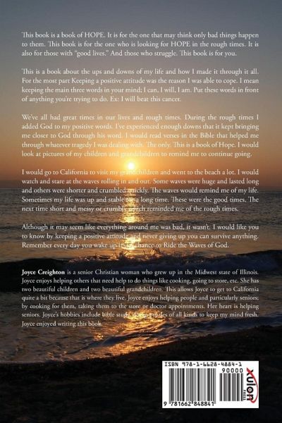 This book is a book of HOPE. It is for the one that may think only bad things happen to them. This book is for the one who is looking for HOPE in the rough times. It is also for those with "good lives." And those who struggle. This book is for you. This is a book about the ups and downs of my life and how I made it through it all. For the most part Keeping a positive attitude was the reason I was able to cope. I mean keeping the main three words in your mind; I can, I will, I am. Put these words in front of anything you're trying to do. Ex: I will beat this cancer. We've all had great times in our lives and rough times. During the rough times I added God to my positive words. I've experienced enough downs that it kept bringing me closer to God through his word. I would read verses in the Bible that helped me through whatever tragedy I was dealing with. The only. This is a book of Hope. I would look at pictures of my children and grandchildren to remind me to continue going. I would go to California to visit my grandchildren and went to the beach a lot. I would watch and stare at the waves rolling in and out. Some waves were huge and lasted long and others were shorter and crumbled quickly. The waves would remind me of my life. Sometimes my life was up and stable for a long time. These were the good times. The next time short and messy or crumbly which reminded me of the rough times. Although it may seem like everything around me was bad, it wasn't. I would like you to know by keeping a positive attitude and never giving up you can survive anything. Remember every day you wake up it is a chance to Ride the Waves of God. Joyce Creighton is a senior Christian woman who grew up in the Midwest state of Illinois. Joyce enjoys helping others that need help to do things like cooking, going to store, etc. She has two beautiful children and two beautiful grandchildren. This allows Joyce to get to California quite a bit because that is where they live. Joyce enjoys helping people and particularly seniors; by cooking for them, taking them to the store or doctor appointments. Her heart is helping seniors. Joyce's hobbies include bible study, doing puzzles of all kinds to keep my mind fresh. Joyce enjoyed writing this book.
