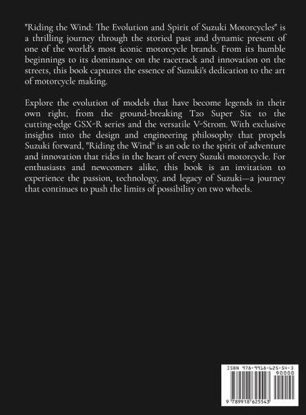 "Riding the Wind: The Evolution and Spirit of Suzuki Motorcycles" is a thrilling journey through the storied past and dynamic present of one of the world's most iconic motorcycle brands. From its humble beginnings to its dominance on the racetrack and innovation on the streets, this book captures the essence of Suzuki's dedication to the art of motorcycle making. Explore the evolution of models that have become legends in their own right, from the ground-breaking T20 Super Six to the cutting-edge GSX-R series and the versatile V-Strom. With exclusive insights into the design and engineering philosophy that propels Suzuki forward, "Riding the Wind" is an ode to the spirit of adventure and innovation that rides in the heart of every Suzuki motorcycle. For enthusiasts and newcomers alike, this book is an invitation to experience the passion, technology, and legacy of Suzuki-a journey that continues to push the limits of possibility on two wheels.