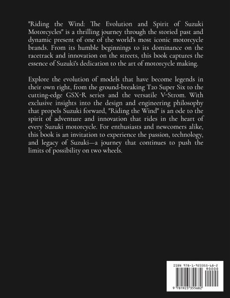 "Riding the Wind: The Evolution and Spirit of Suzuki Motorcycles" is a thrilling journey through the storied past and dynamic present of one of the world's most iconic motorcycle brands. From its humble beginnings to its dominance on the racetrack and innovation on the streets, this book captures the essence of Suzuki's dedication to the art of motorcycle making. Explore the evolution of models that have become legends in their own right, from the ground-breaking T20 Super Six to the cutting-edge GSX-R series and the versatile V-Strom. With exclusive insights into the design and engineering philosophy that propels Suzuki forward, "Riding the Wind" is an ode to the spirit of adventure and innovation that rides in the heart of every Suzuki motorcycle. For enthusiasts and newcomers alike, this book is an invitation to experience the passion, technology, and legacy of Suzuki-a journey that continues to push the limits of possibility on two wheels.